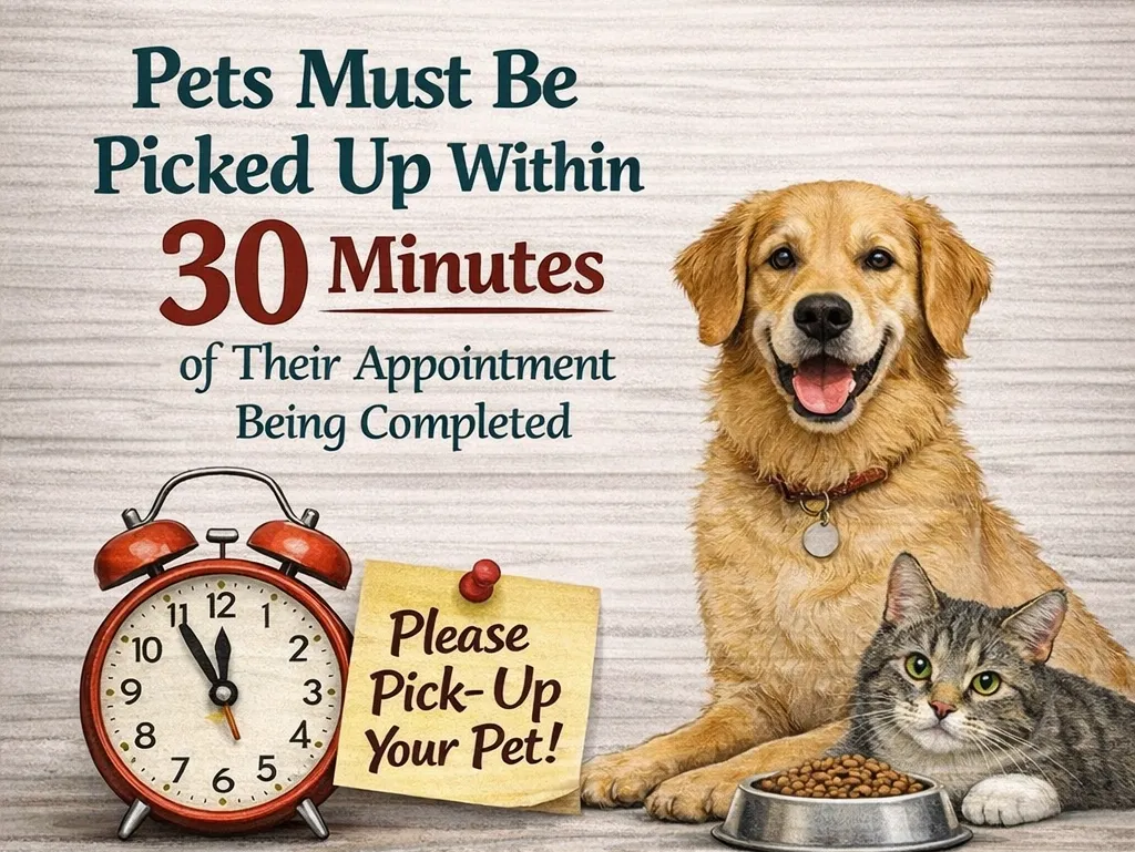 To ensure the comfort and safety of every pet in our care, we kindly ask that pets be picked up within 30 minutes of their grooming appointment being completed.